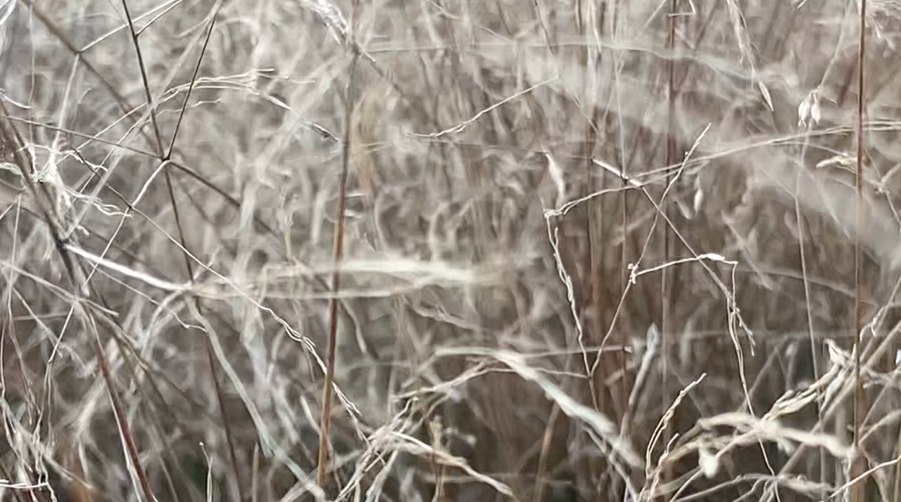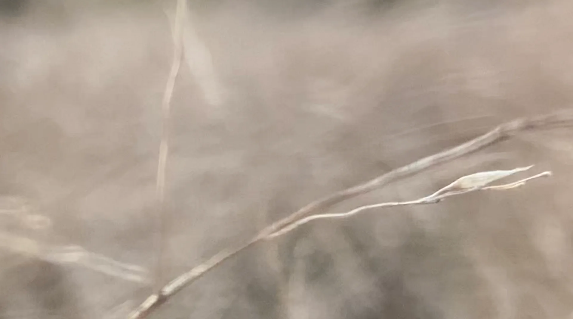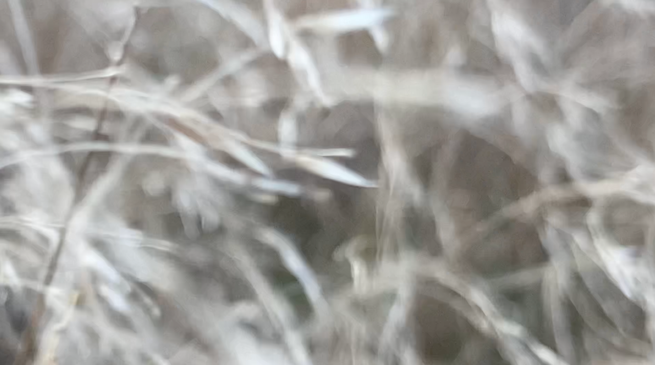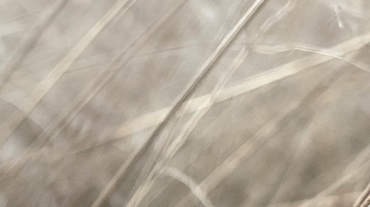After the catastrophe comes a radical change of scale. From an enormous forest before which people sometimes trembled, but which for centuries soothed and elevated, allowing one to experience cathartic ecstasy, attention shifts to the clumps of drying grass swaying in the wind. In the hairgrass, only the fingertips are immersed, gently brushed by delicate spikes. The hand reaches as deep as possible into the hairgrass’s mane, while the rest of the body guards the experience, taking on pleasant shivers—the body tenses and contracts to allow wading through the grass. The tickled hand rewards the numbness of the other limbs, and the neurons take over the storytelling. The feeling of immersion returns, mediated by the screen’s magic. The video material reveals the beauty of alternating blur and sharpness. In a slowed rhythm, giving a sense of breath and relief.
