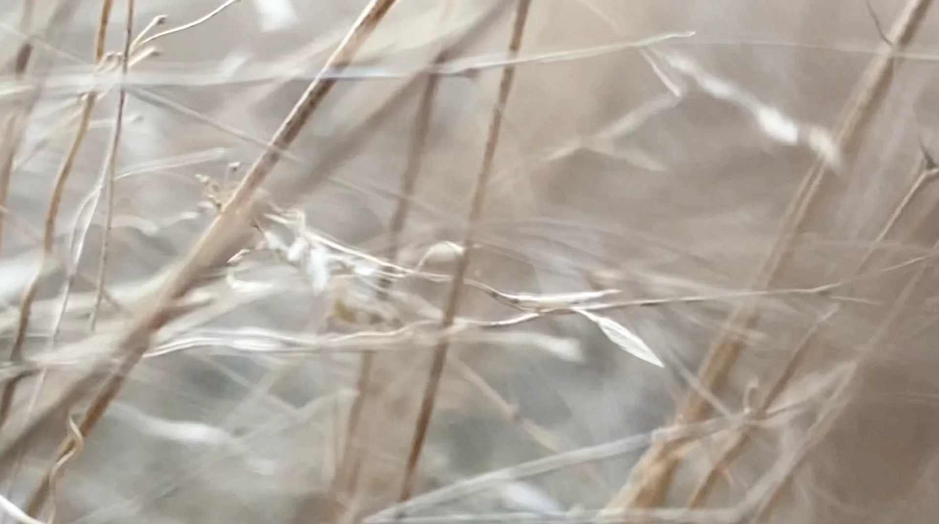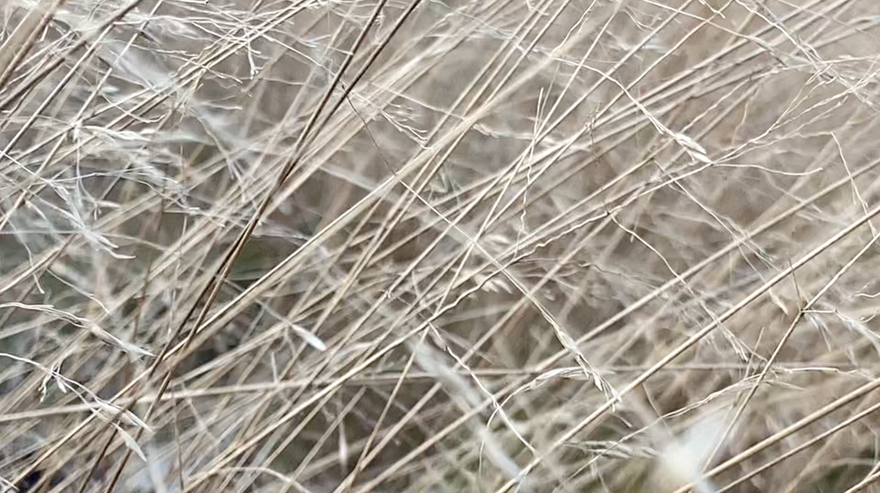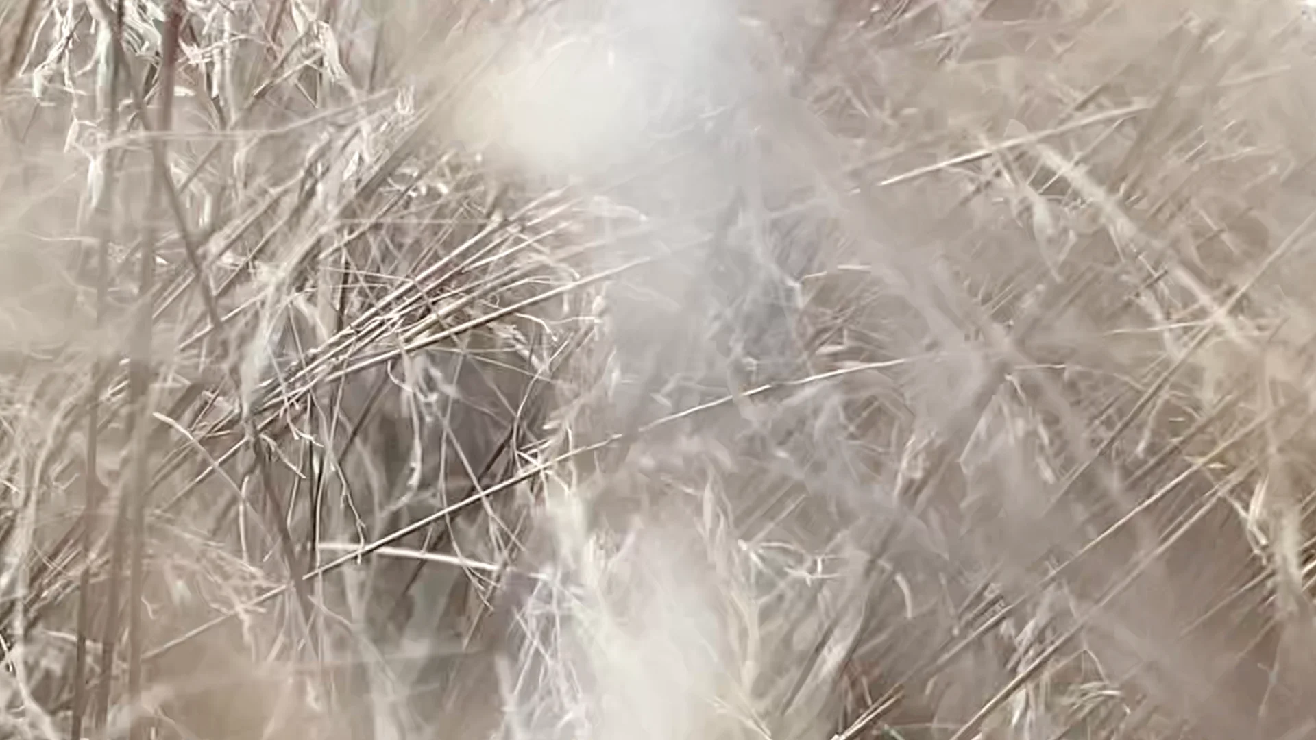 After the catastrophe comes a radical change of scale. From an enormous forest before which people sometimes trembled, but which for centuries soothed and elevated, allowing one to experience cathartic ecstasy, attention shifts to the clumps of drying grass swaying in the wind. In the hairgrass, only the fingertips are immersed, gently brushed by delicate spikes. The hand reaches as deep as possible into the hairgrass’s mane, while the rest of the body guards the experience, taking on pleasant shivers—the body tenses and contracts to allow wading through the grass. The tickled hand rewards the numbness of the other limbs, and the neurons take over the storytelling. The feeling of immersion returns, mediated by the screen’s magic. The video material reveals the beauty of alternating blur and sharpness. In a slowed rhythm, giving a sense of breath and relief.