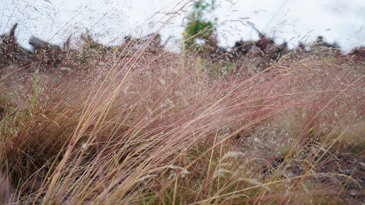 Hairgrass is the grass inhabiting the Mound—a pioneer species covering the soil of the Lack of Forest. It had particular significance for me. I loved placing my hand into the mound’s miniature jungle created by it, a sensual thicket, and stroking its golden—and, after prolonged sun exposure, ruby—locks. I would immerse myself in it sometimes with my hand, sometimes with the camera. A beautiful jungle reveals itself to a machine zoom or to the human eye. All you need to do is lie down or crouch to watch the ballet of the hairgrass. Lean in and move through an extraordinary world, the colour of shining straw. Something unnoticed at first, especially for an eye untrained in gardening, reveals itself in the moment of touch. The trigger of sensations is a small pleasure, the tickling of ankles, hands, and cheeks.